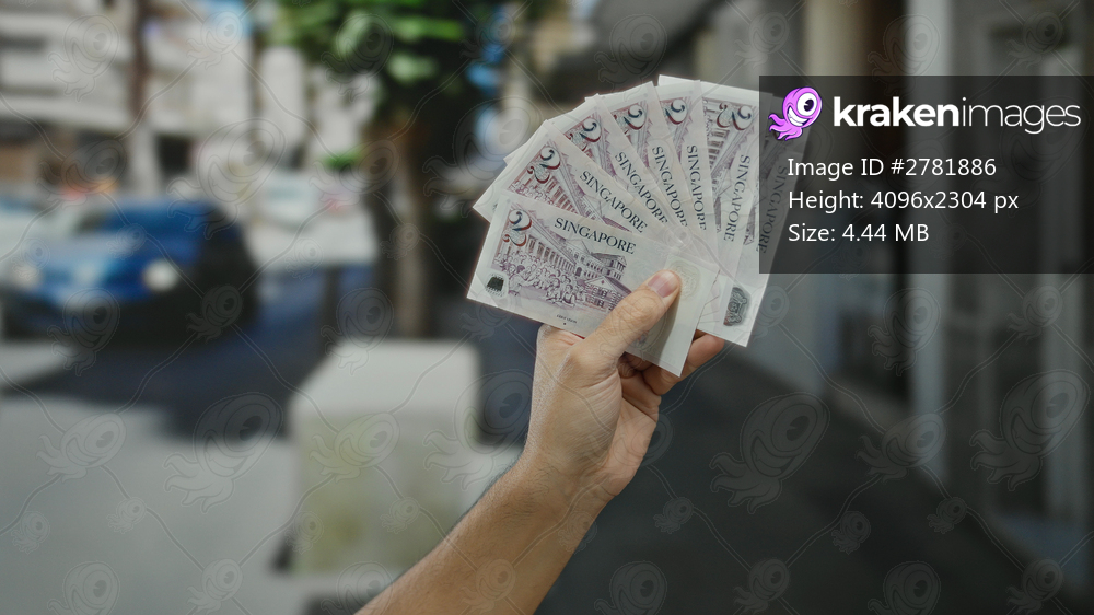 Man holding singapore dollars on a street, showcasing banknotes in an outdoor urban setting, with blurred cars and buildings in the background.