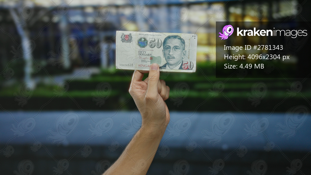 Man holding singapore dollars on street in city showcasing currency in outdoor setting against blurred background.