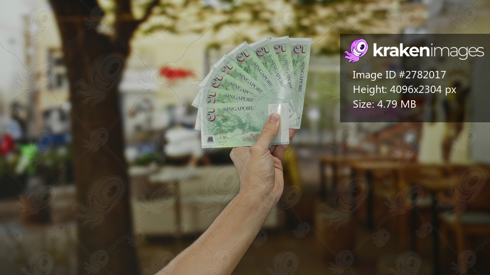 Man holding singapore dollars outdoors at a city cafe terrace with a blurred street background.