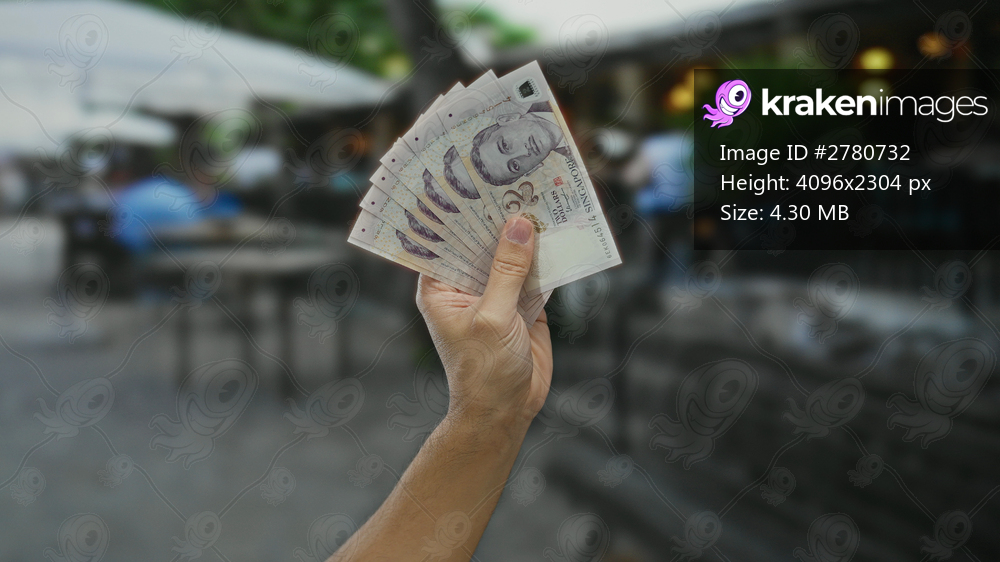 Man holding singapore dollars outdoors at a coffee terrace in a city street setting, capturing the vibrant urban environment.