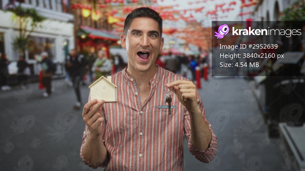 Man holding small wooden house and dangling keys between fingers on a busy street in the city; excitement new homeowner.
