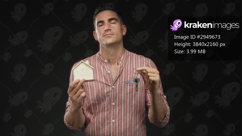 Man holding small wooden house and keys with bare hands in studio with black backdrop, wearing striped shirt and closed eyes; homeownership contemplation. - Kraken Images