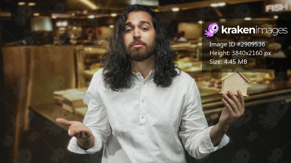 Man holding small wooden house model with open palms in restaurant building, looking to camera; uncertainty choice.