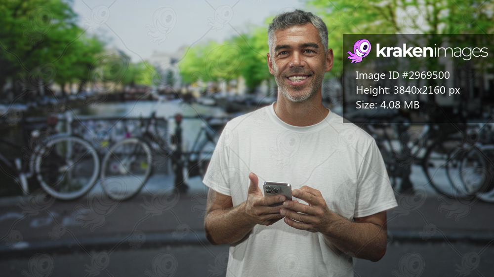 Man holding smartphone with bare hands, thumb tapping screen on street by canal bridge; urban leisure contentment.