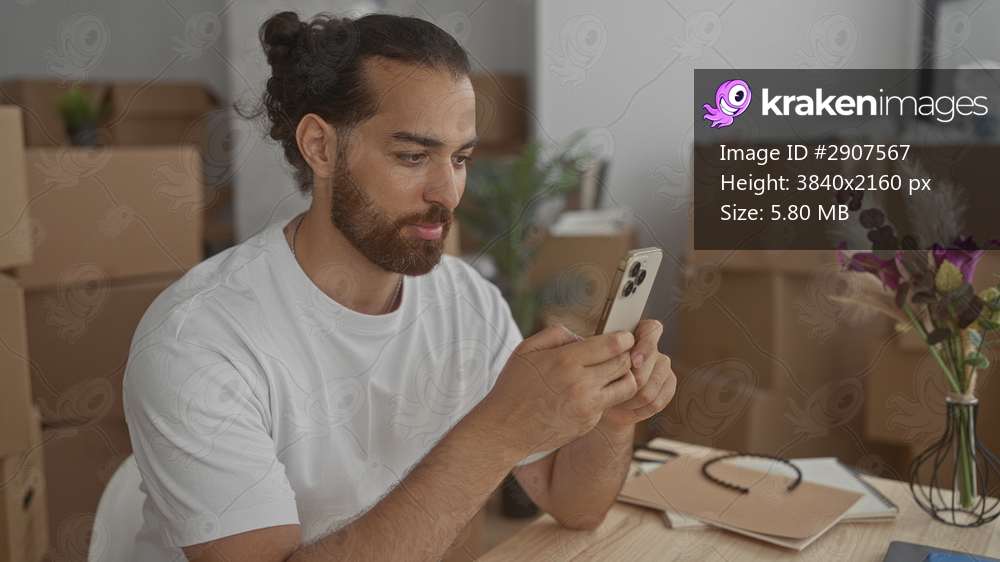 Man holding smartphone with both hands at table in building surrounded by moving boxes and vase; quiet concentration.