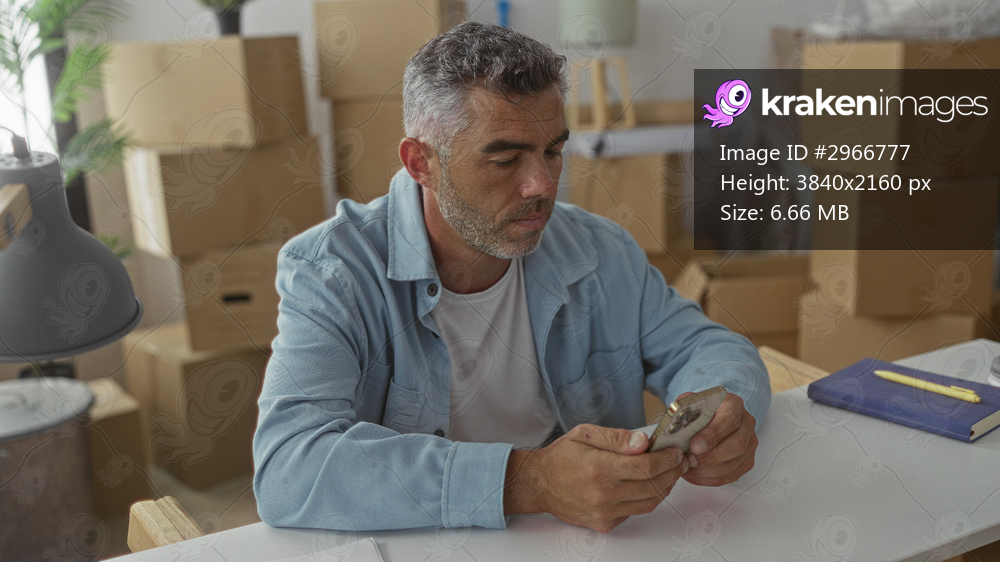 Man holding smartphone with both hands at table, scrolling in new home building surrounded by stacked moving boxes and a desk lamp; pensive relocation. - Kraken Images
