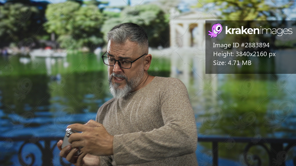 Man holding smartphone with both hands by a lake railing near a building, wearing glasses and a beige sweater; mild frustration.