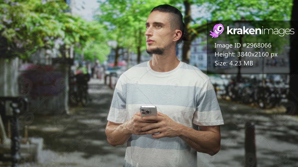 Man holding smartphone with both hands and looking aside on a tree lined city street with bicycles and parked cars; contemplation urban life.