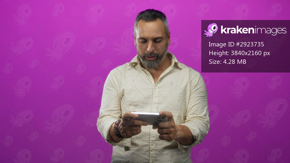 Man holding smartphone with both hands, looking down and grimacing in a purple studio setting; frustration concentration.