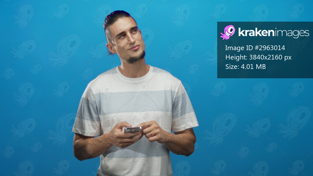 Man holding smartphone with both hands, tapping and glancing down, striped tshirt, slight smile and head tilt in studio; thoughtful ease.