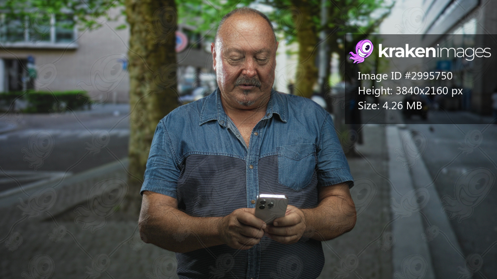 Man holding smartphone with both hands and typing on street beside trees and building; calm contemplation.