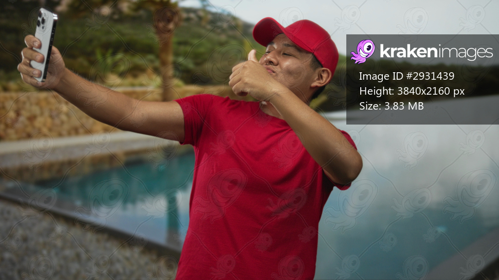 Man holding smartphone by pool near building, wearing red cap and shirt and smiling while checking phone; serenity.