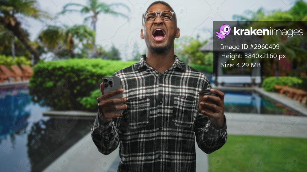 Man holding smartphone and coffee cup, hands and mouth visible while shouting and gripping phone in a studio with resort pool backdrop; frustration.