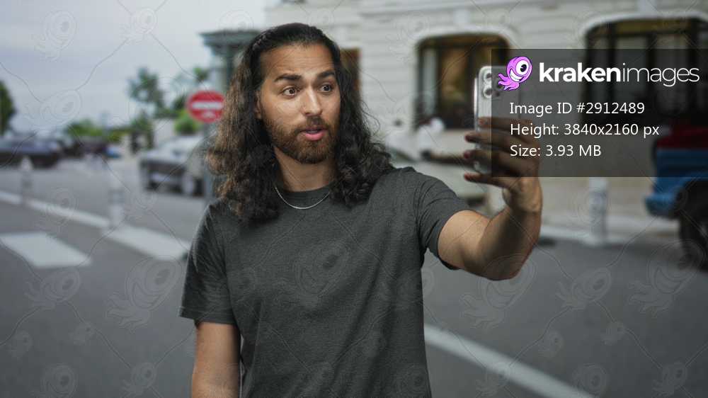 Man holding smartphone for selfie on city street with extended arm and open mouth; curiosity sharing.