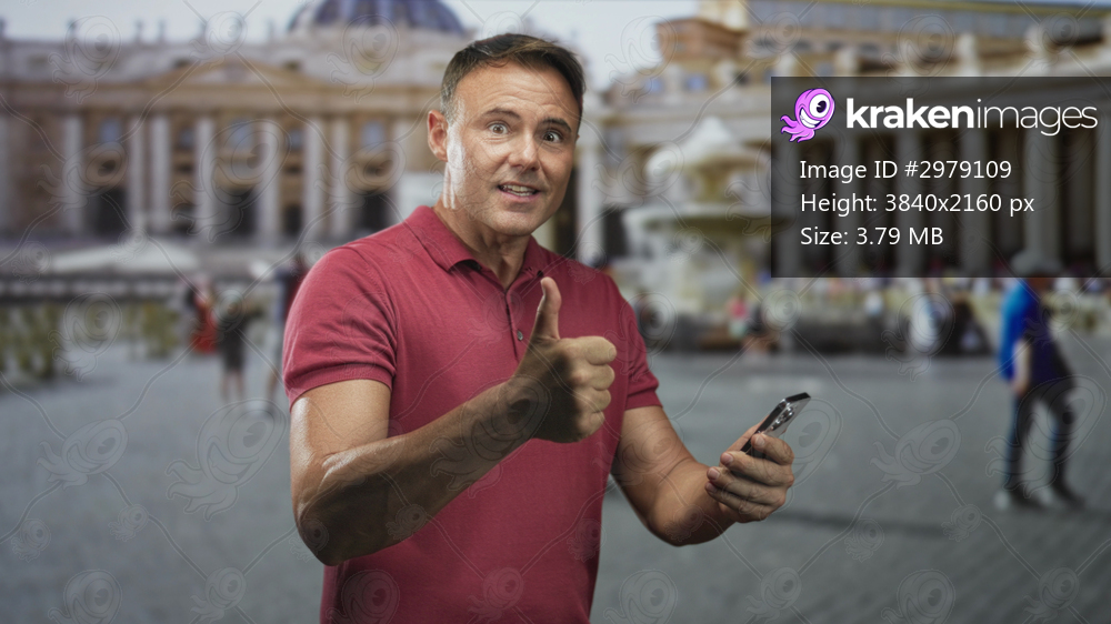 Man holding smartphone gives thumbs up in front of building with fountain and colonnade, blurred tourists in plaza; confidence.