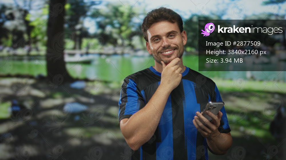 Man holding smartphone with hand on chin and smiling in a sunny park by a pond and trees; thoughtful optimism.