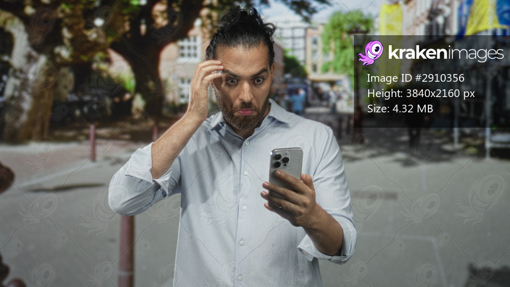 Man holding smartphone, hand to forehead while staring at screen on street in city center; confusion technology problem.