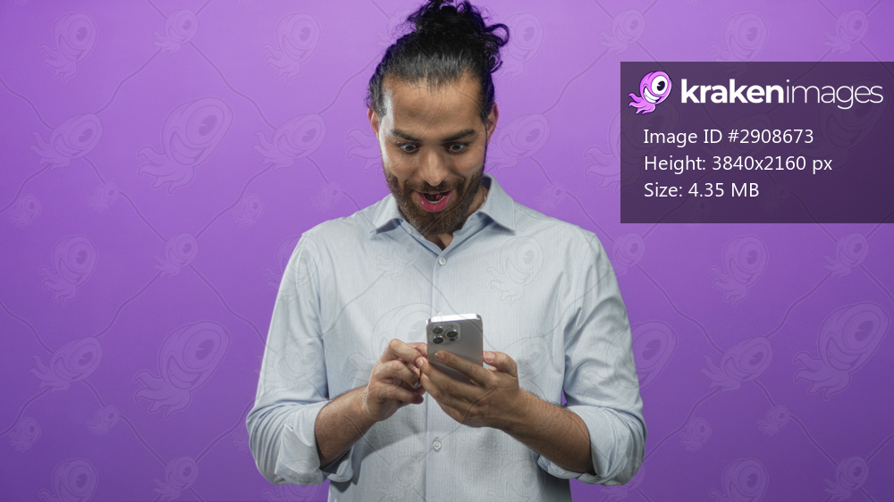 Man holding smartphone with hand to mouth and eyes wide in purple studio; surprise reaction notification.