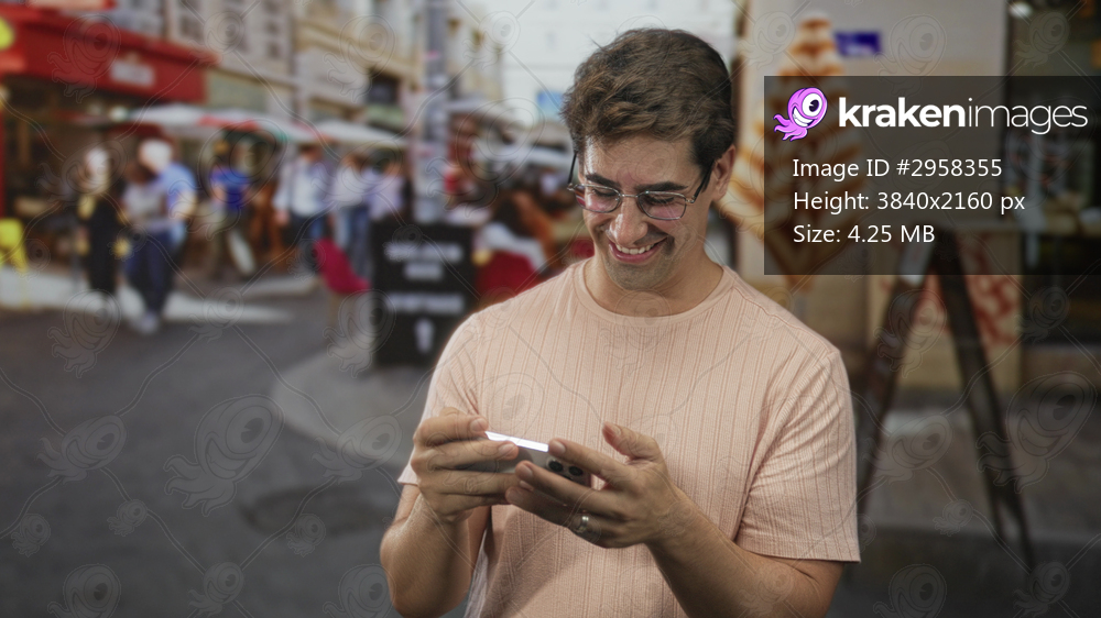 Man holding smartphone with hands, smiling and tapping screen while wearing glasses and a t shirt on a busy street cafe sidewalk; casual joy.