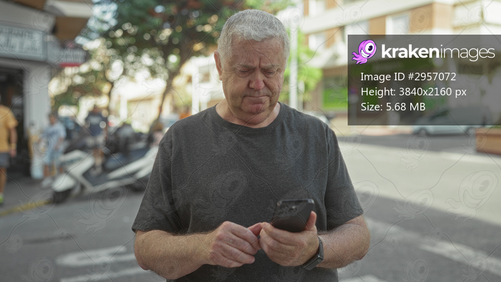 Man holding smartphone, hands tapping screen while looking sideways on a street with scooters and a building crosswalk; quiet concern.