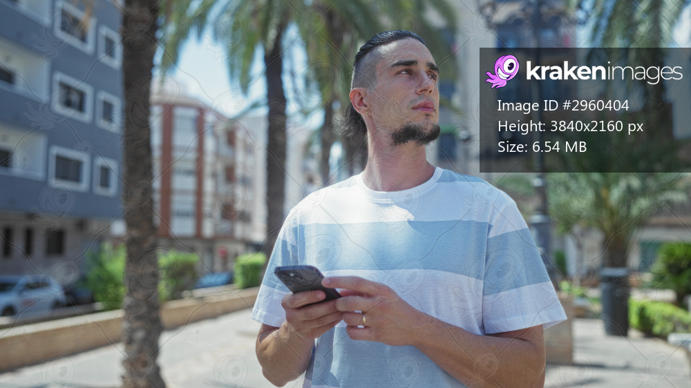 Man holding smartphone with hands visible, looking up on a sunny street near palm trees and buildings; quiet contemplation.