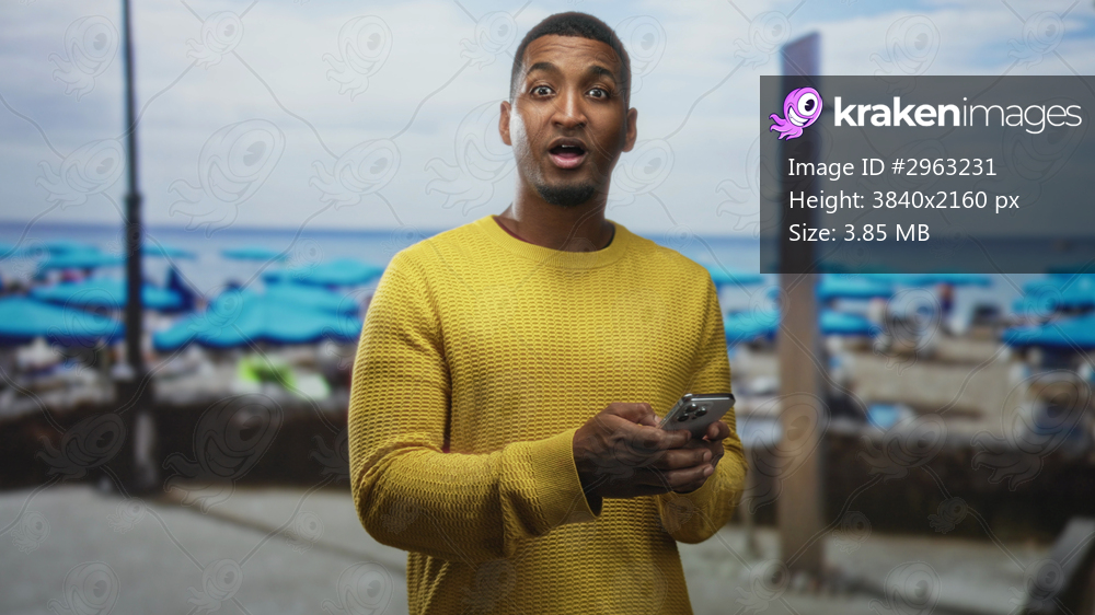 Man holding smartphone, hands visible, texting and looking surprised on a street by beach umbrellas and boardwalk; surprise focus.