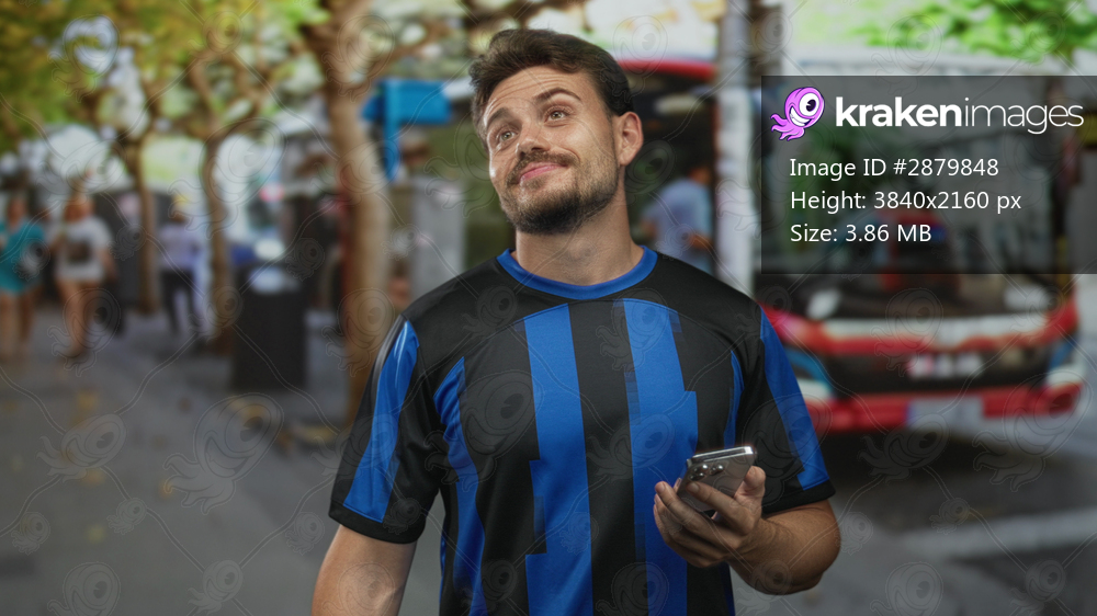 Man holding smartphone in blue striped shirt, smiling and looking up while standing near a bus on a busy city street; urban optimism.