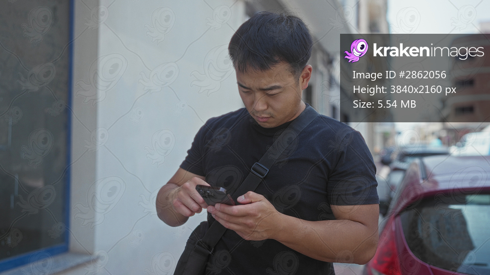 Man holding smartphone in both hands and glancing up amid parked cars on a sunlit city street; urban curiosity.