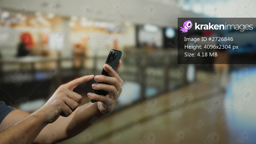 Man holding smartphone in indoor shopping mall with blurred background, focusing on touchscreen, reflecting modern retail technology and communication. - Kraken Images