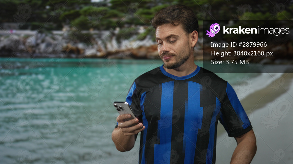 Man holding smartphone and looking at the screen on a sandy beach shore near turquoise water; calm contemplation.