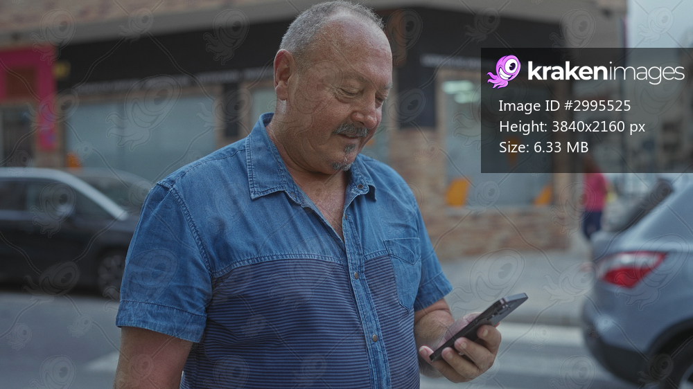 Man holding smartphone looks up on urban street in front of storefront, wearing blue denim shirt; waiting curiosity.
