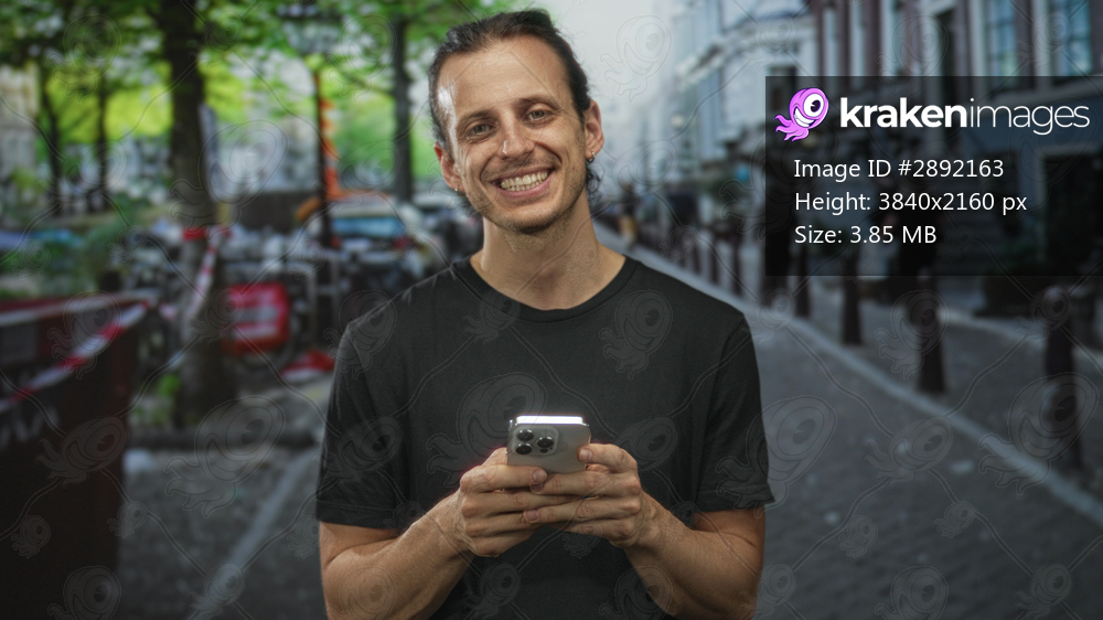 Man holding smartphone on a cobbled city street smiling while looking at screen and holding phone with both hands; casual joy.