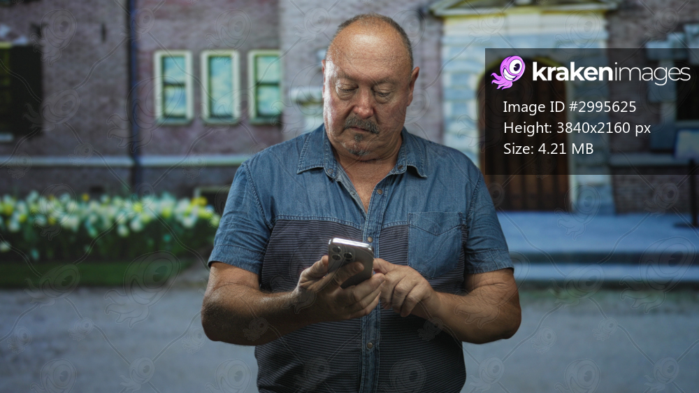 Man holding smartphone with one hand and gesturing with the other while looking down in a studio setting; concerned contemplation.