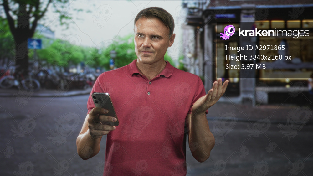 Man holding smartphone with palm up gesture on street in front of a storefront and bicycle rack, looking at the screen with a furrowed brow; digital frustration. - Kraken Images