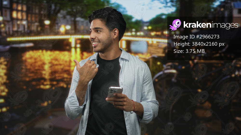 Man holding smartphone, pointing thumb over shoulder on street by canal and bridge at night with glowing lights; relaxed connection.