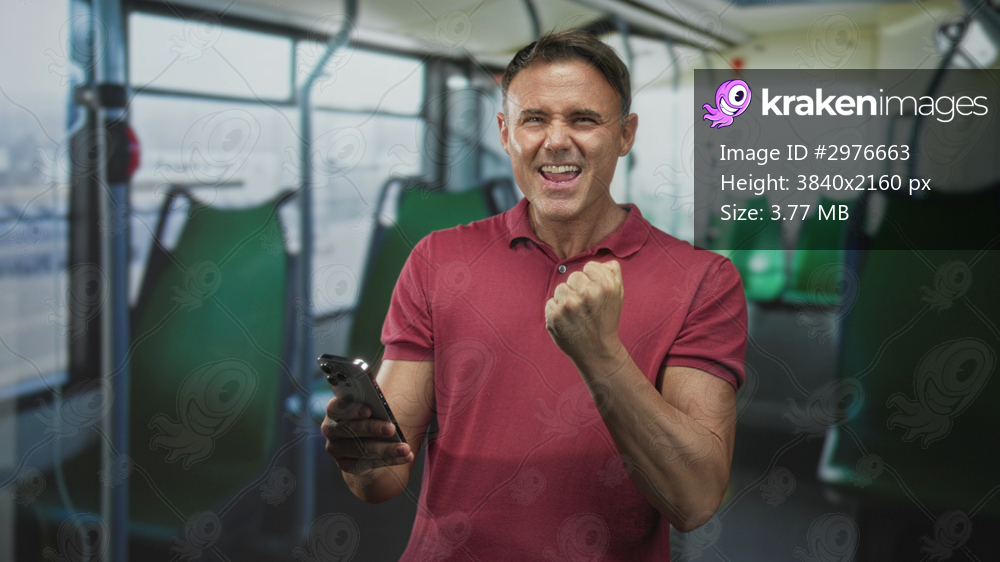 Man holding smartphone pumps clenched fist while seated on a bus on a city street, green seats visible; triumph.