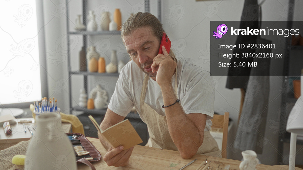 Man holding smartphone and reading notebook in pottery studio; concentration productivity planning.