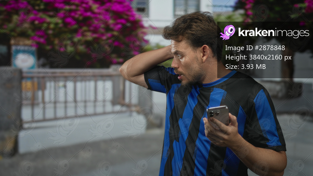Man holding smartphone with right hand, looking at screen on street in front of building near flowering bushes; focus curiosity.