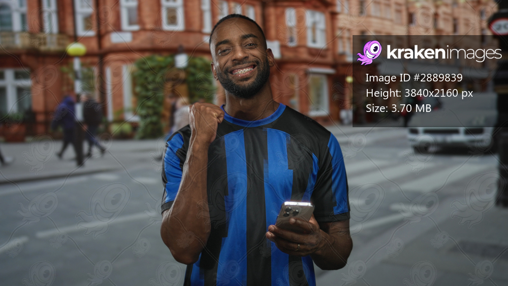 Man holding smartphone and smiling with fist pump on city street, wearing blue soccer jersey and showing hand and braces; celebration.