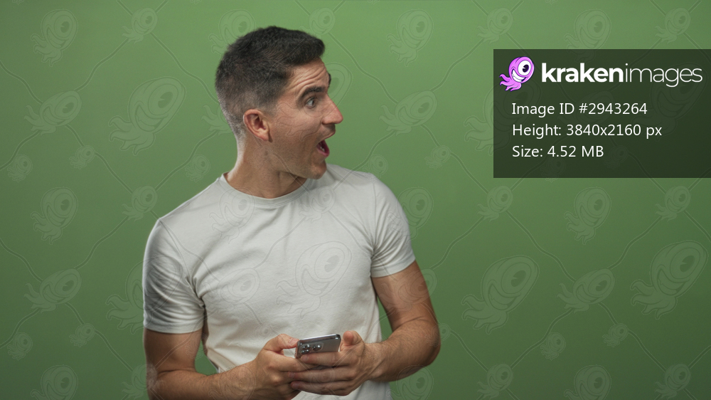 Man holding smartphone, smiling and looking down with visible hands and forearms in green studio; contentment connection.
