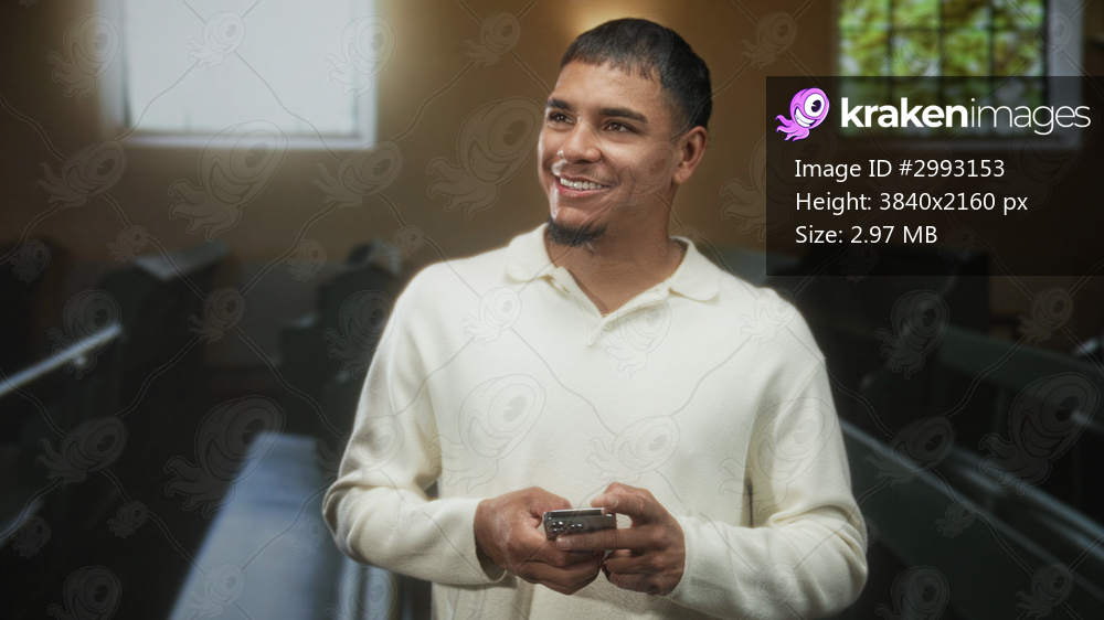 Man holding smartphone and smiling while typing with bare hands in a church building with pews and stained glass windows; happiness connection faith.