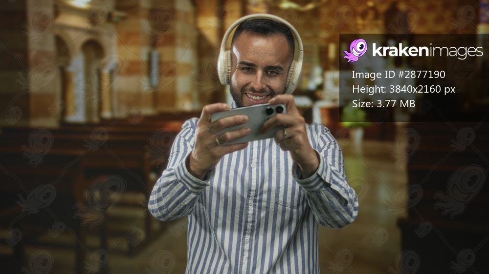 Man holding smartphone and smiling while wearing headphones in a catholic church interior, facing camera; serenity.