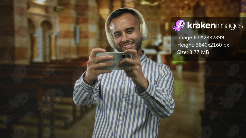 Man holding smartphone and smiling while wearing headphones in a catholic church interior, facing camera; serenity.