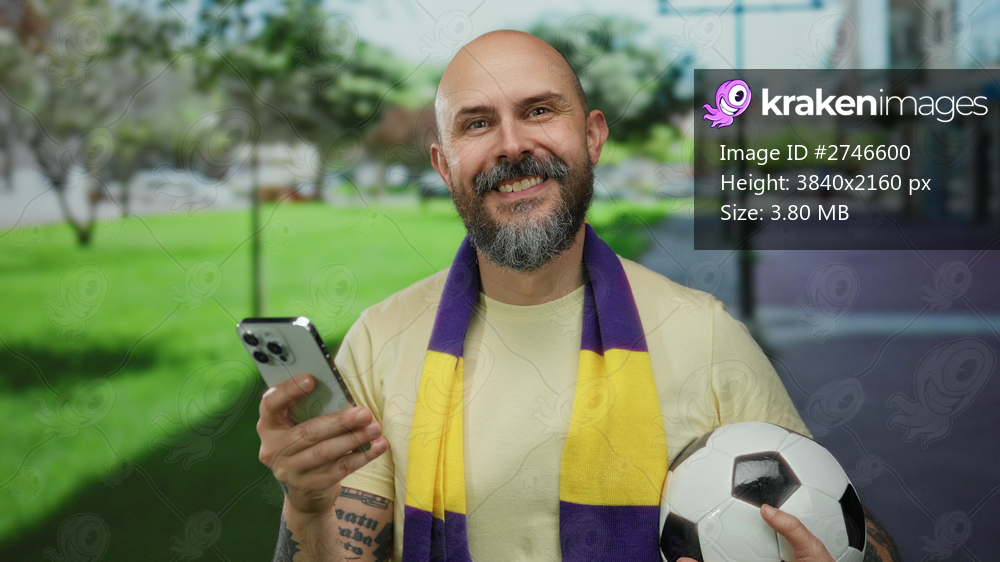 Man holding smartphone and soccer ball in park wearing yellow shirt and scarf with trees in background and tattoos visible