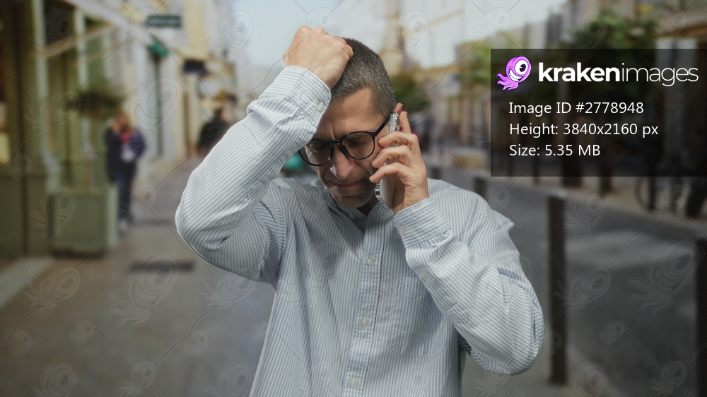 Man holding smartphone talking outdoors on street wearing glasses looking concerned capturing urban scene with people walking in background