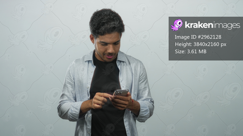 Man holding smartphone, tapping screen with finger and smiling while checking messages in studio; social connection joy.