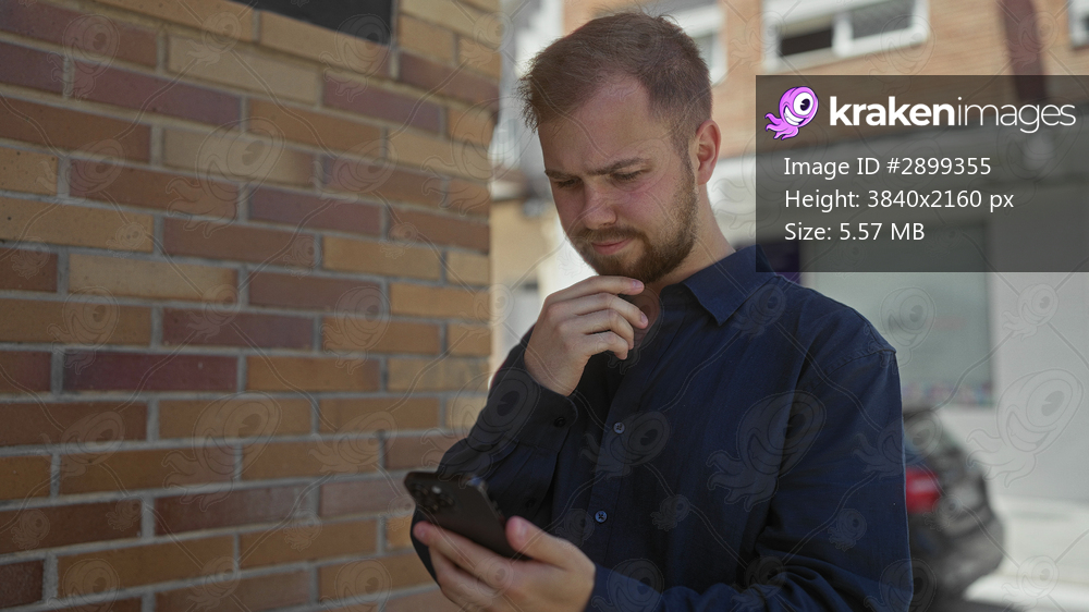 Man holding smartphone, tapping screen and with hand on chin by a brick wall on street; thoughtful decision focus.