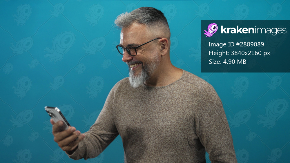 Man holding smartphone and texting with thumbs in studio against teal backdrop wearing glasses and sweater; calm focus.