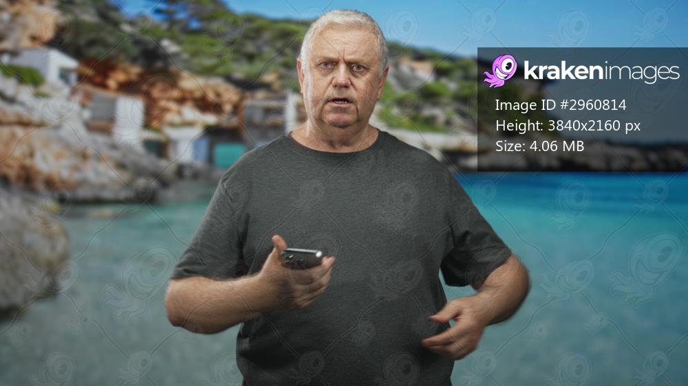 Man holding smartphone, thumb tapping screen at a rocky seaside cove beach with turquoise water and cliffs; puzzled reflection.