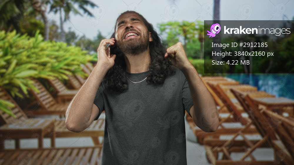Man holding smartphone to ear, clenched fist and closed eyes by pool lounge chairs at studio set; joy celebration.